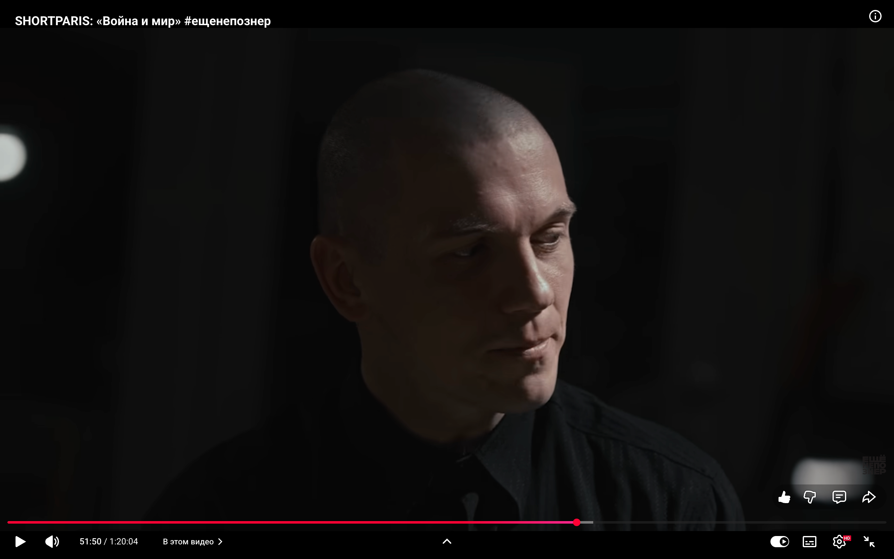 "На мой взгляд, вот это неумение видеть отдельную трагедию отдельного человека применимо к историческим событиям — одна из главных проблем нашей культуры, нашей общественности сейчас. И когда мы планировать своё будущее исходя из достоинства человеческой жизни, из ценности человеческой жизни, многое пойдёт иначе. (00:55:20)