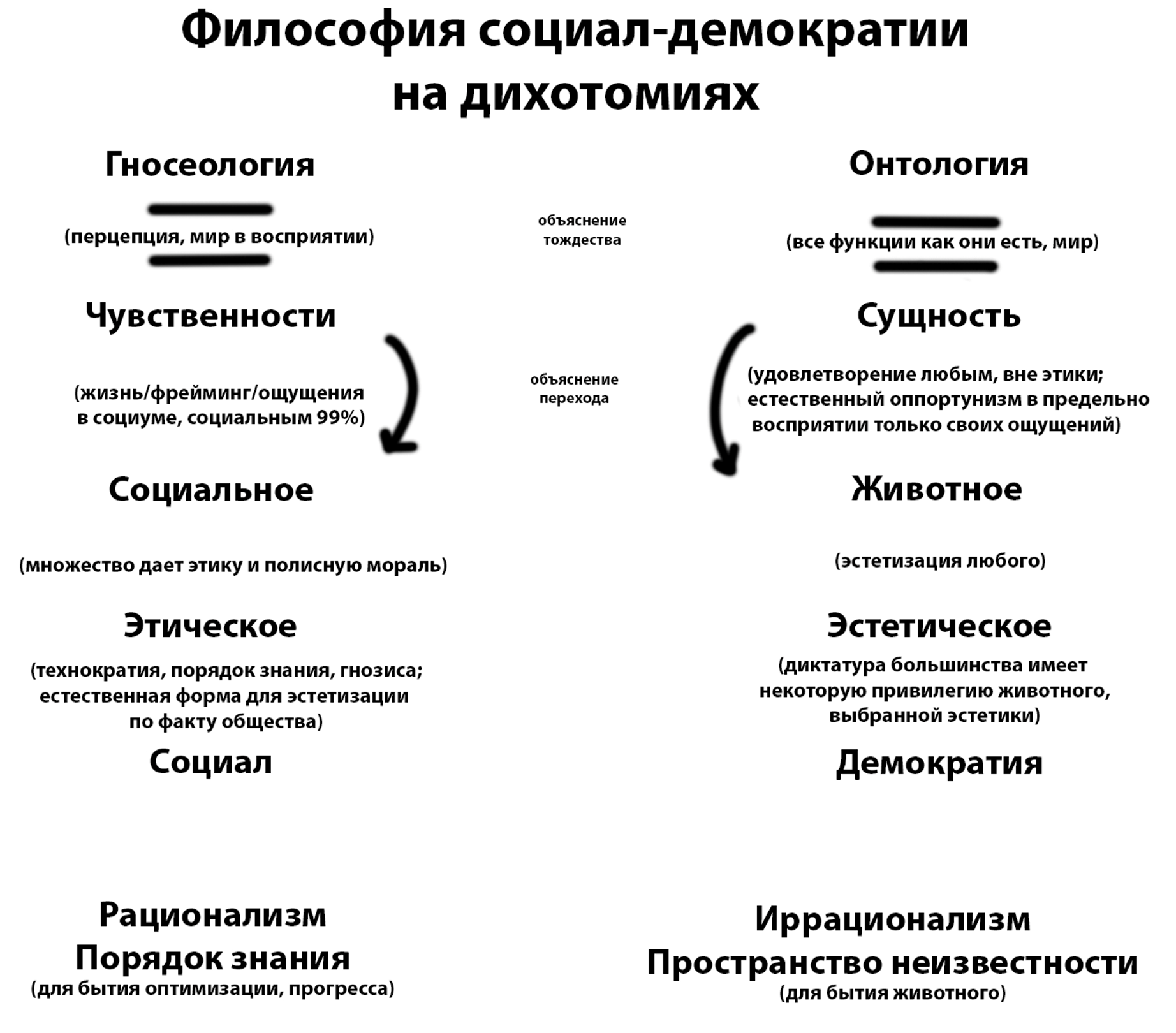 Основная идея социал-демократии в полном принятии как правил социального конструирования, так и правого ролевого компонента в нём. Сохранении меритократии рынка, при нивелировании немеритократических правил силы и накопления в нем. Расширении социальных и целевых программ при целеполагании через государство, таким образом чтобы система распределяла ресурсы на воспроизведении прав, свобод и материальном благоденствии большинства так, чтобы в центре было счастье и образование (конструирование держится на счастье достойной жизни как самоцели и образовании как его сохранности и прогрессировании). Социал-демократия опирается на общественный системный характер любого достижения цивилизации, оставляя место и системам вне прямой организации. Исходя из системности общества и индивида, а не жизни множества маугли в пещерах (чем было бы отсутствие системности). Опирается на насколько возможно аллокацию денег, т. е. акций на трудовые ресурсы, в системо-образующие счастье высокого уровня жизни целевые индустрии и базовые потребности (как например медицина). Так же, насколько возможно и само эстетическое потребление, составляющее условно 90% наших экономик сфер развлечений, должно быть этическим. Проще говоря, возможность качественного велфеира и зарплат (левый аспект) при широте атомарных отношений (правый аспект) — главный маркер и симптом максимально оптимизированной функции государства и общества, что мы видим на примере известных сегодня социальных государств. Представьте, что мы дадим тем же маугли, одному ничего, а второму акции на разный труд тысячи других, звучит не очень даже с точки зрения эффективности, не говоря о сути этики, а ведь это повсеместное распределение в более суровых частях капитализма.