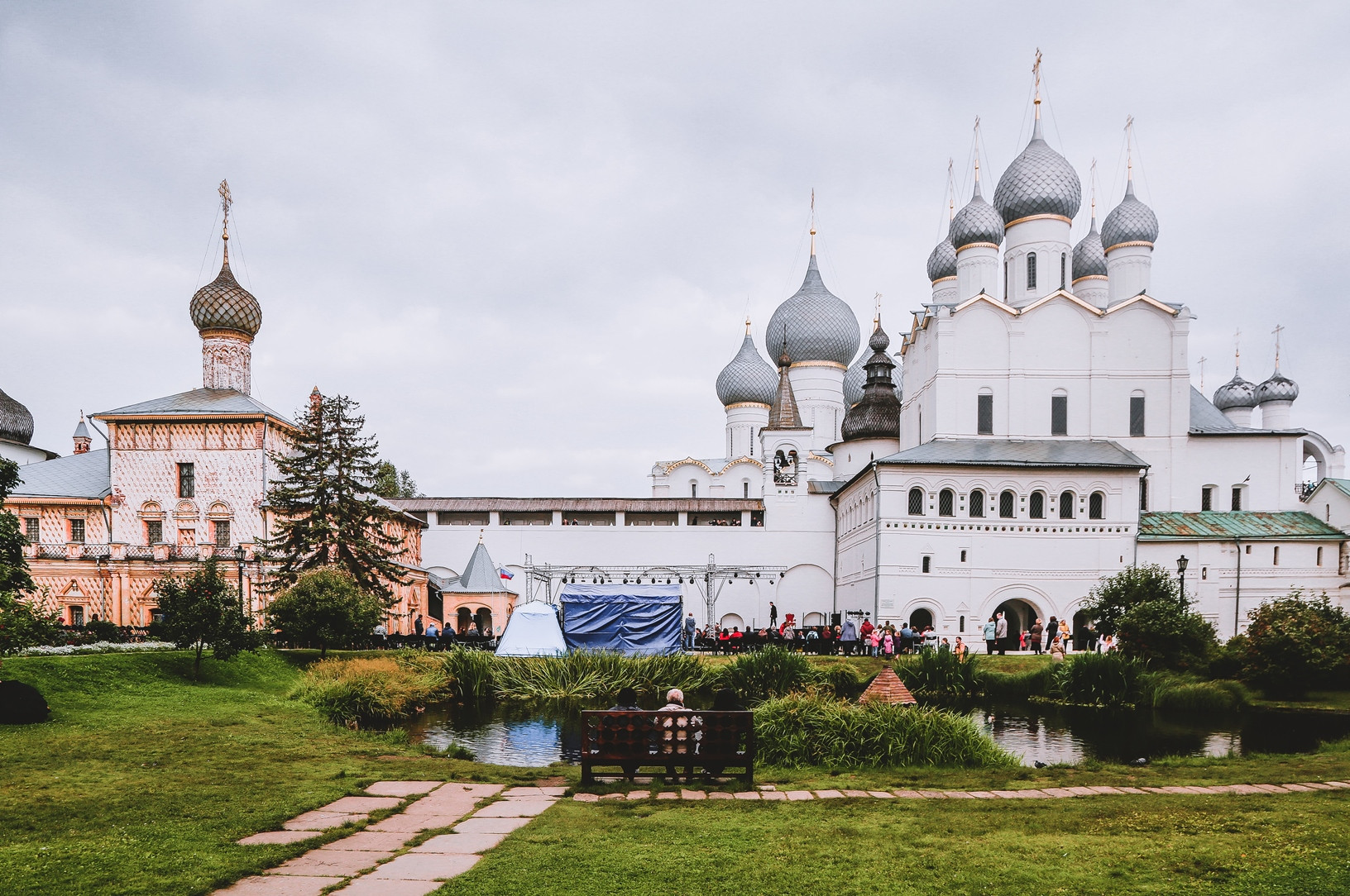 Хотя название «Гамлет» первым произнес главный режиссер «Театра на Покровке» Геннадий Шапошников — переходы и башни Ростовского кремля вдруг навели его на мысль об Эльсиноре, и они с Волосниковым принялись за работу. И вот, наконец, настал час «Ч", все репетиции позади, зрители стремительно заполняют архиерейский двор: пришедшие пораньше успели занять стулья, остальные устроились — кто на ступенях церквей, кто на скамеечках у пруда, или даже прямо на земле. Установленные между церквями Воскресения и Одигитрии помосты для актеров и сцена для оркестра ждут своих героев, правда, последние не спешат… Начало мероприятия было запланировано на половину девятого, но, видимо, организаторы дожидались, пока двор накроют густые синие сумерки, в которых очертания предметов становятся расплывчаты и смутны — и всё сильнее верится, что перед тобой и впрямь Эльсинор. А византийский распев "Agios a Theos» в исполнении хора «Моисей Петрович», открывающий действие, вполне может сойти за погребальную песнь датскому правителю, под которую прямо среди зрительных рядов движется процессия вдовствующей королевы Гертруды.