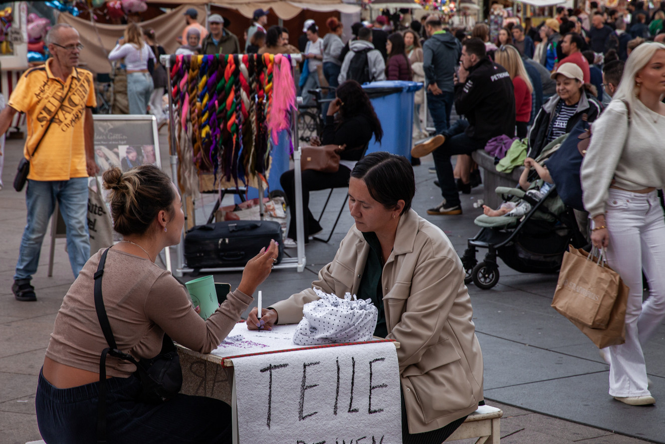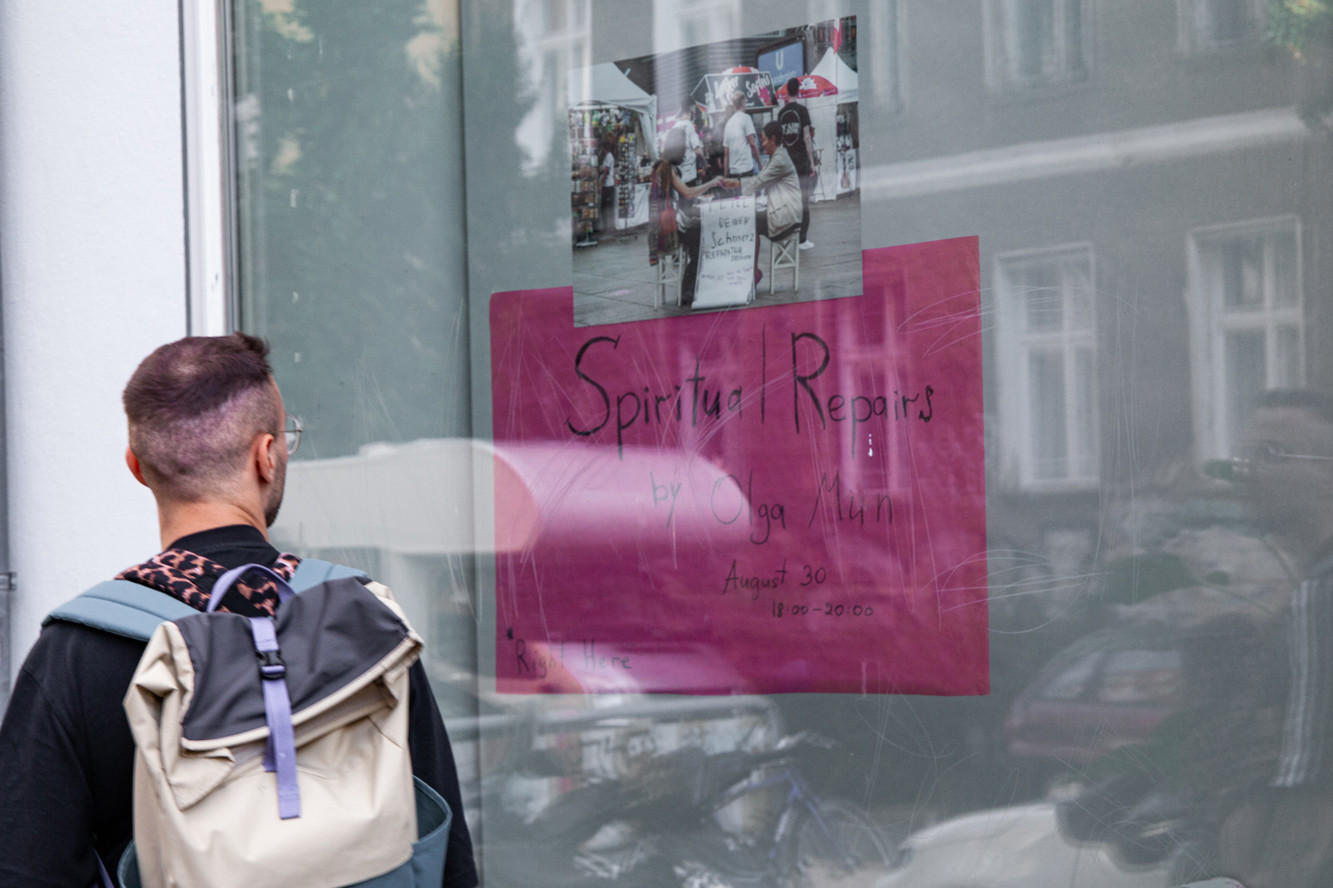 I would call the space we created together in the center of the cacophony an in-between space. Its legal status is suspended. The regulations are unclear, and different actors perceive and use it simultaneously and in very different ways. Right in the middle of one of the reparative sessions, two men from private security approached us and said that Alexanderplatz now belonged to a private individual who had bought the space for a private fashion show, and therefore we had to leave the public-now-private space. We insisted that this nonplace is an in-between space and that there is room here for us and many others who do not fit into private formats. We managed to defend our right to be present and to act there.