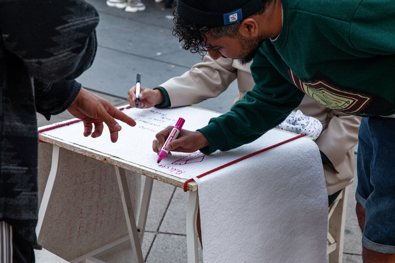 Such a performance and artistic intervention brought unexpected conclusions. Whilst I anticipated the participants to share their reflections on commonly discussed issues of institutional exclusions in the academy, such as racism and sexism, for example, the majority of the participants shared their very personal micro-stories. Some were about a recent heartbreak, a broken family relationship, a miscarriage. Most participants were women, with a few men writing solidarity words with Palestine on a collective piece of paper, which was used as a canvas to write on during a performance.
