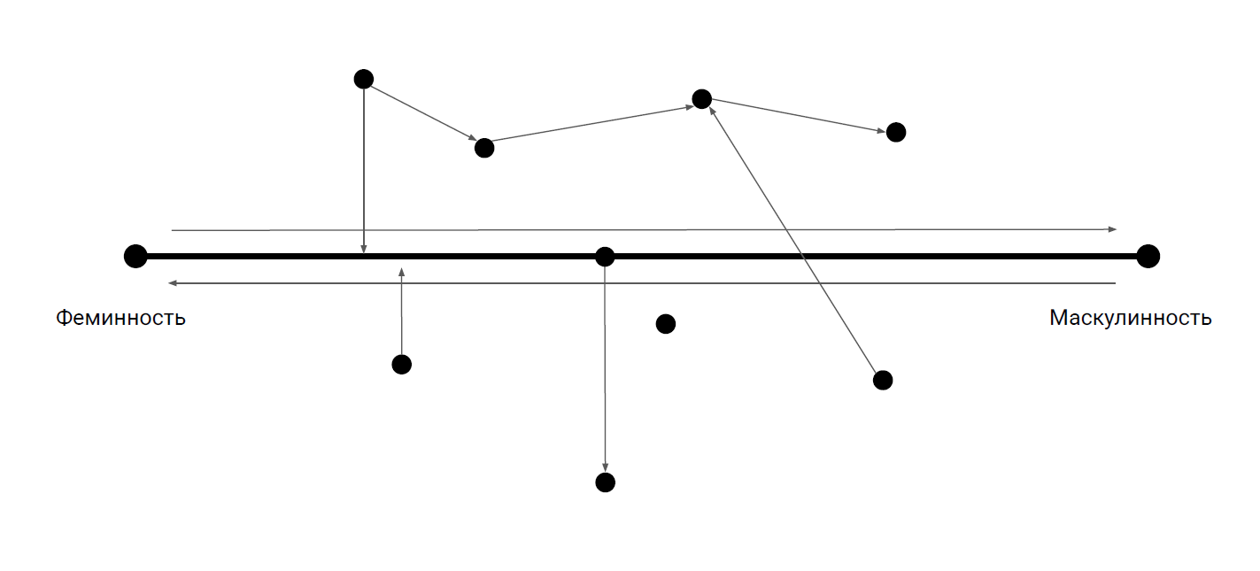 • Трансгендерные активистикс и те, кто изучают гендер, используют метафору континуума. Такая метафора уже лучше, поскольку она допускает широкий спектр гендеров между полюсами мужчина/мужское и женщина/женское. Мне не нравится эта модель по двум причинам: во-первых, из-за мужской, а во-вторых, из-за женской части. Серьезно, зачем использовать эти две точки, по которым мы определяем себя, когда мы не можем точно сказать, из чего состоят эти две фиксированные точки и как они определяются?