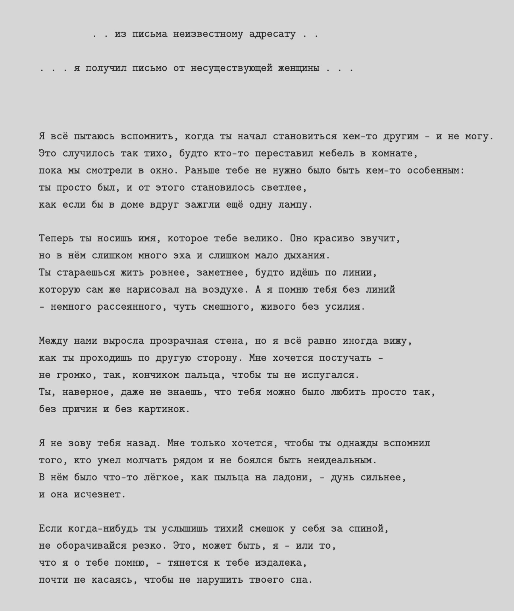 Подаренный браслет, билет, зажигалка, записка — любая такая вещь — это не предмет. Это остановленное движение руки, которое когда-то коснулось другой руки. Ключ не к комнате и не к человеку, а к состоянию, которое больше не воспроизводится.