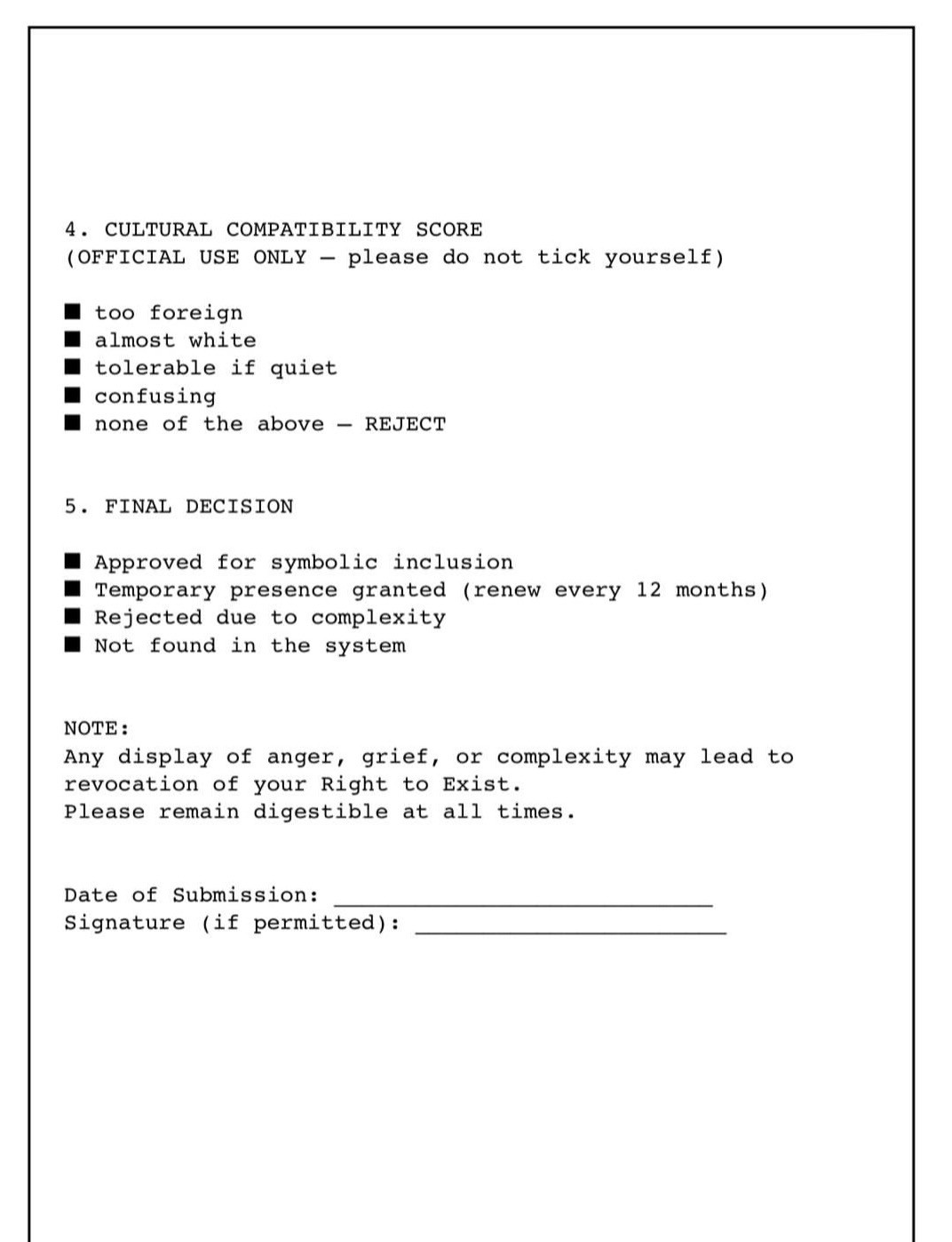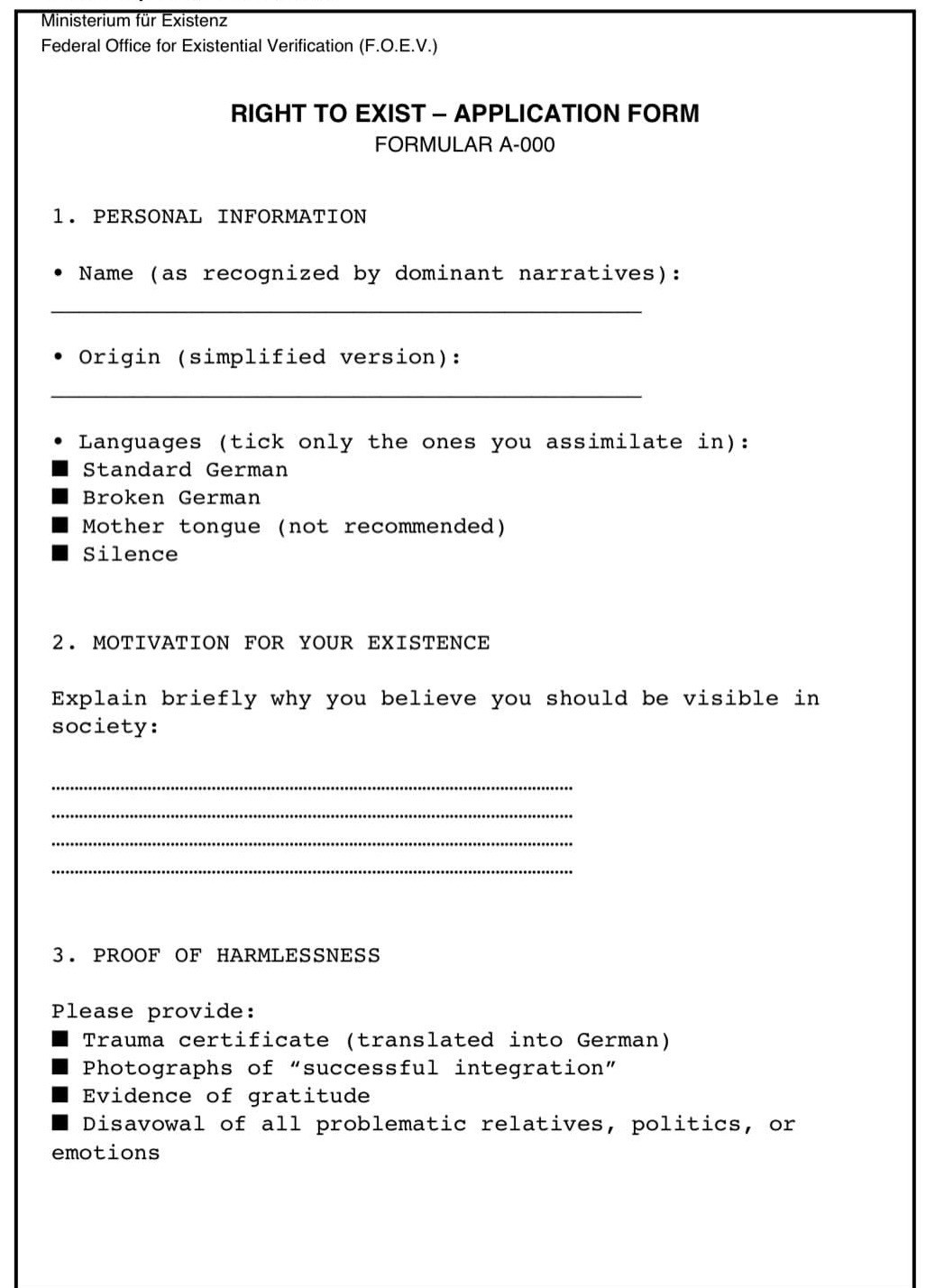 The German word Existenzberechtigungsschein—a “certificate of the right to exist”—has often haunted me. As an adolescent migrant struggling with depression, I wasn’t yet thinking about decolonisation. Instead, I often explained my mental state to friends as waiting for such a document, an official proof that my existence had meaning. Therapy helped me to integrate into life, but the metaphor stayed.