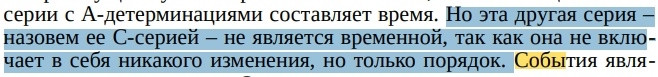 Событием мактаггарт называет не конкретную точку, а содержание позиции, события обладают сами по себе позицией во времени, когда он говорит, что N в В серии относительно всегда является лишь событием, которое можно актуализировать из любого вектора времени. События содержат в себе изменения, он у себя же в статье говорить что в нумерически различных моментах изменения нет, и отсюда он говорит о событиях уже не только о том, что меняется в реальности, но и несёт в себе изменение времени. Или например такие моменты, когда события вдруг начинают быть событиями будущего (это вообще как?), можно сделать предсказание в таком случае, но на примере смерти королевы Анны он заявляет, что есть лишь одно отношение — темпоральное. При этом он видимо завязывается лишь на результате, а не на процессе, затрагивая лишь готовящееся событие. Сам Мактаггарт явный сторонник А теории (скрин 1). Один из аргументов Мактаггарта: Изменение невозможно, если моменты времени упорядочены только по B серии. И всё притом, что оказывается не может быть В серии, поскольку нужно как-то заключать изменения, изменения делаются во времени, следовательно необходима А серия. Упорядочивание по А серии влечет за собой противоречие, что значит противоречивость реальности времени, от чего он делает вывод, что время не существует. С серия вообще не является временной (скрин 2). Не понял вообще тейк про то что изменения не реальны, при том что время предполагает само изменения и изменяется перетекая из одних индексов в другие. Если ты про то, что Мактаггарт говорит об изменениях в качествах, то А серия так-то предполагает и изменения качества, если фрагмент события перестал существовать или появился, то мы, безусловно, должны были получить изменение. И это именно что касается реальности. Он говорит, например, что "событие никогда не может перестать быть событием. Оно никогда не может выйти из какого-либо временного ряда, в котором оно когда-то было". Чтобы нормальное событие перестало существовать, достаточно, чтобы оно перестало существовать в более позднее время. Как только мы начинаем говорить о выходе из временного ряда, мы переходим к разговору о фрагментах событий, а не о реальных событиях. И как только мы начинаем говорить об этом, мы переходим от разговора об изменениях в реальности к разговору об изменениях во временном ряду. Единственное замечание состоит в том, что он не может прийти к выводу о нереальности времени, если ограничится только одним вариантом среди прочих. Проблема в том, что именно к этому он и приходит. То что ему приходится серии соединять и присоединять ещё и С серию является регрессом, поскольку ради восполнения надо присоединять тогда ещё больше серий и времён, позже он отвергает возможность изменения временных рядов и тем самым отвергает адекватность B серии, учитывая его представление об изменениях, и получается, что В серия не может объяснить изменения, хотя они происходят и с самим временем в одну сторону. Потом начинает говорить, чтобы создать направление в изменении нужно добавить С серию, у которого времени вообще нет, следовательно оно не есть чистое различие или качество, по первому скрину он заявляет, что каузальность есть среди качеств и событий. Зачем подсоединять С серию, когда в А серии мы имеем дело не просто с изменением во внешнем ее ра