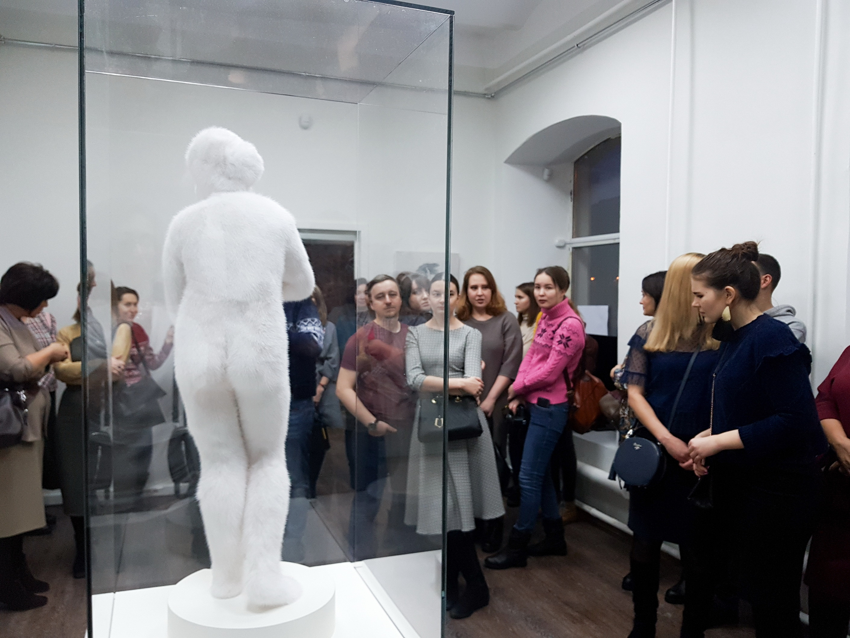 Художница помещает нас в белое пространство своих произведений, в выставочный “белый куб”, в центре которого главный экспонат — “Венера в мехах”, дополняет экспозицию вышивки на плюше “Венера в бегах”, “Нимфа у фонтана ушла” и монументальное живописное полотно “Венера в снегах”. Рафинированность экспозиции отличительная черта всех выставок Наташи –минимальное количество объемных объектов дополнено плоскостными работами. Так было на двух предыдущих выставках: в “Страшных сказках” был представлен “Ленин в зимнем уборе”, “Медвежья земля”, “Вязаный суп”, в “Таёжных сказках” — “Колыбельная”. Наташа постепенно и неспешно знакомит нас с каждым экспонатом, предоставляя возможность обдумать и привыкнуть к её видению.