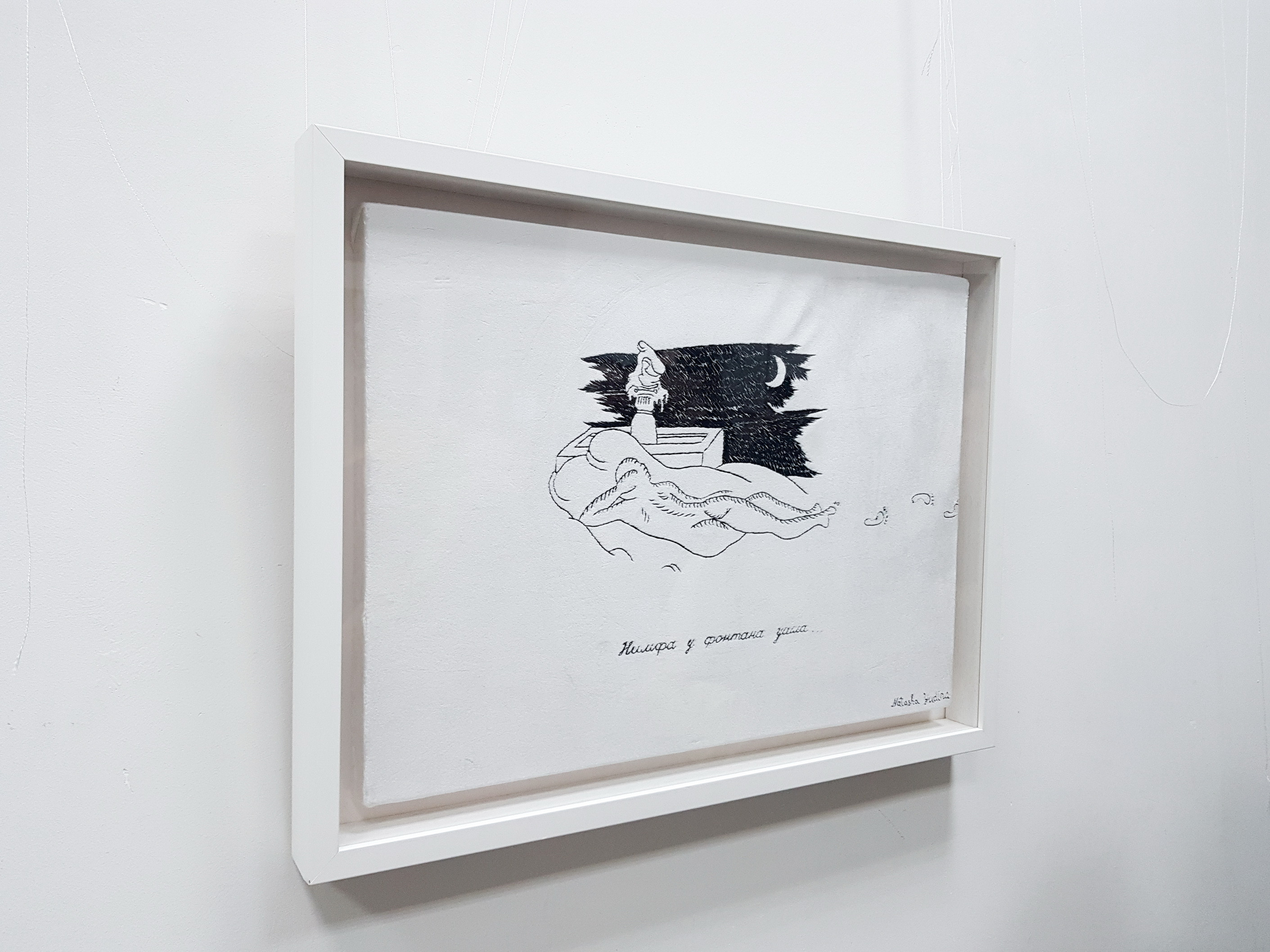 В вышивке “Нимфа у фонтана ушла” обыгрывается история “Нимфа у фонтана” Лукаса Кранаха Старшего. Сюжет известной картины эпохи Северного Возрождения продолжается в сибирских реалиях: темная холодная ночь, заледеневший фонтан, и только отпечаток от недавно лежащего тела нимфы и следы ног на снегу. Кроме игры с сюжетом, возникает параллель между холодной цветовой гаммой художников Северного Возрождения, продиктованной климатическими условиями и белым цветом, который современная художница из Томска намеренно выбирает для большинства своих произведений.