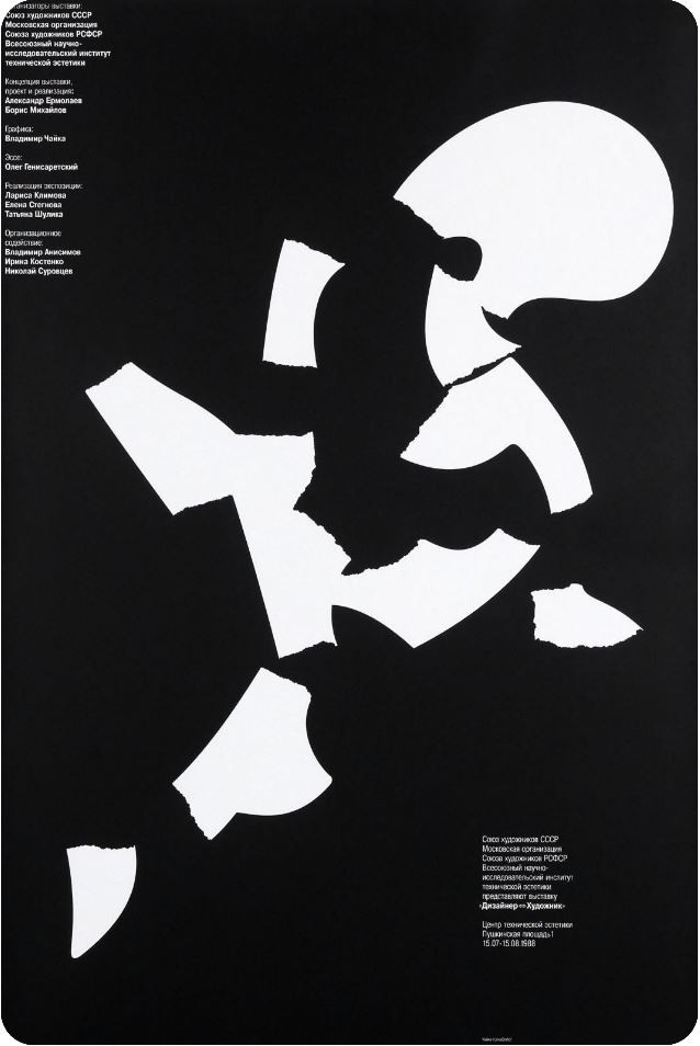 A series of posters by Vladimir Chaika, created in 1988, for the exhibition “Designer <> Artist”, which was held at the Center for Technical Aesthetics in Moscow. The series of posters consists of four sheets, on a card in the Russian State Library these sheets are called: “Essay on art and design” (sheet No. 1), “List of participants of the exhibition” (sheet No. 2), “Information about responsibility” (sheet No. 3), “Image of fragments of patterns” (sheet No. 4).