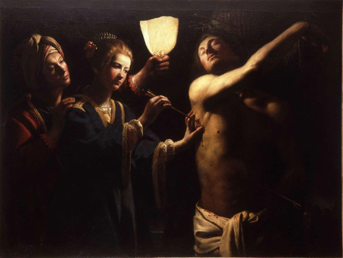 Технику кьяроскуро (то есть резкое противопоставление света и тени) стали активно использовать в сюжете из жития, когда юношу во тьме находит христианка Ирина. На полотнах с такой тематикой лишь тонкий огонёк свечи ставит акценты и вытягивает из тьмы детали картины: изнеможённое тело Себастьяна, испуганное лицо девушки, когда она понимает, что юноша ещё жив или тягостный процесс извлечения стрел из тела мученика.