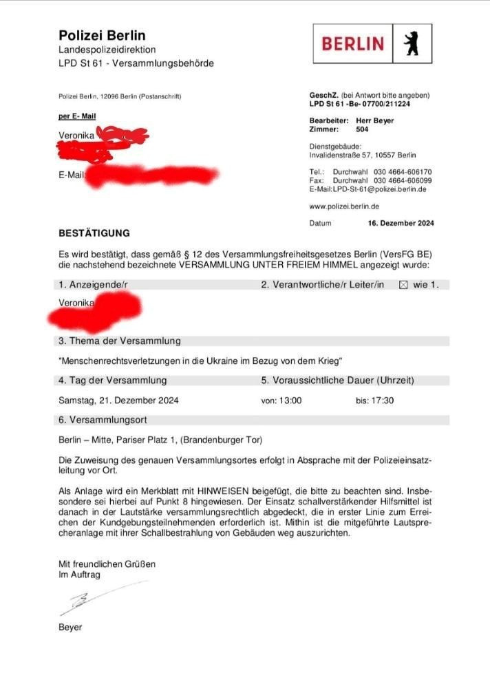 We organized the December actions ourselves. The Berlin event was officially registered under the name of our supporter Veronika, as confirmed by the registration documents.
