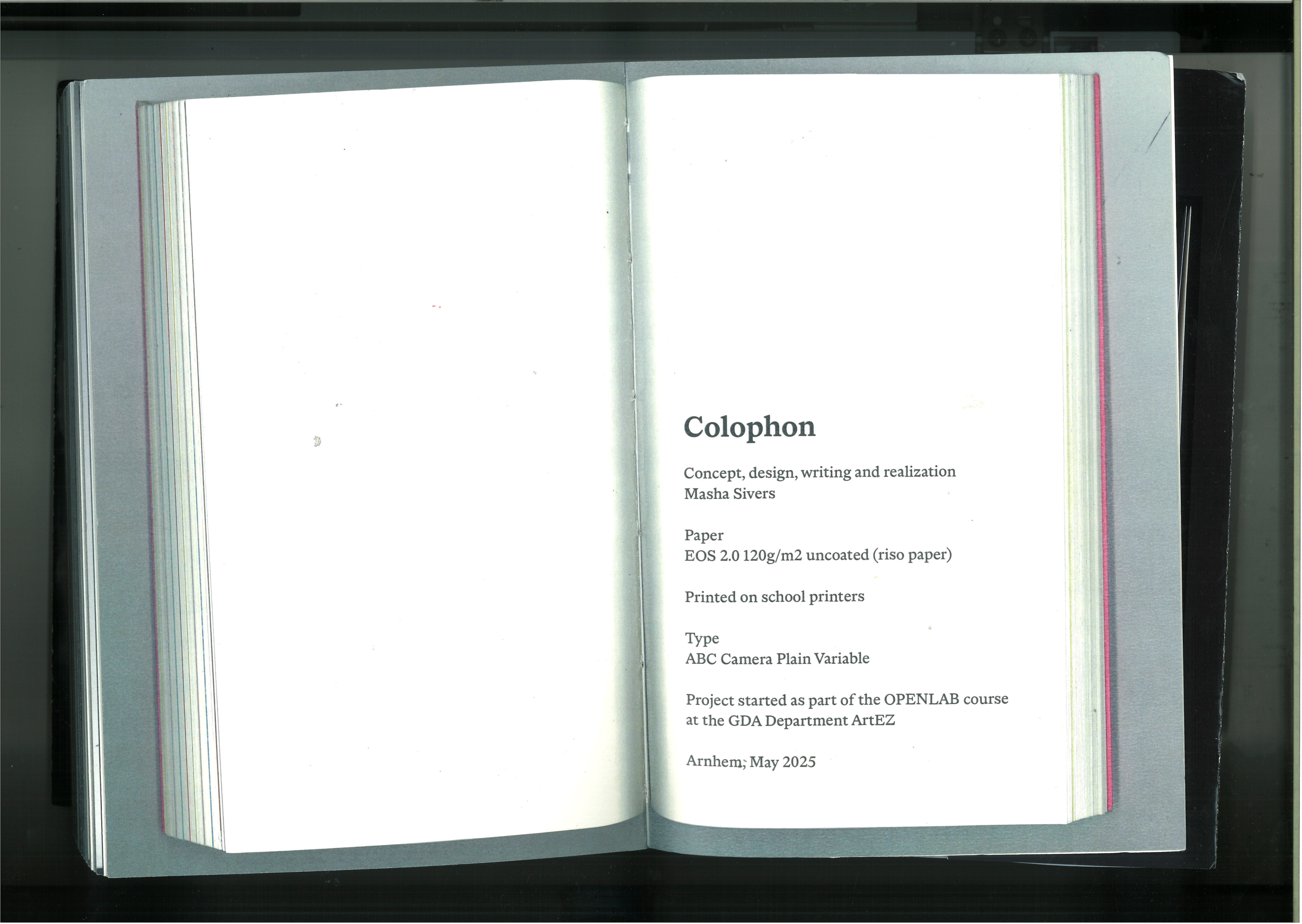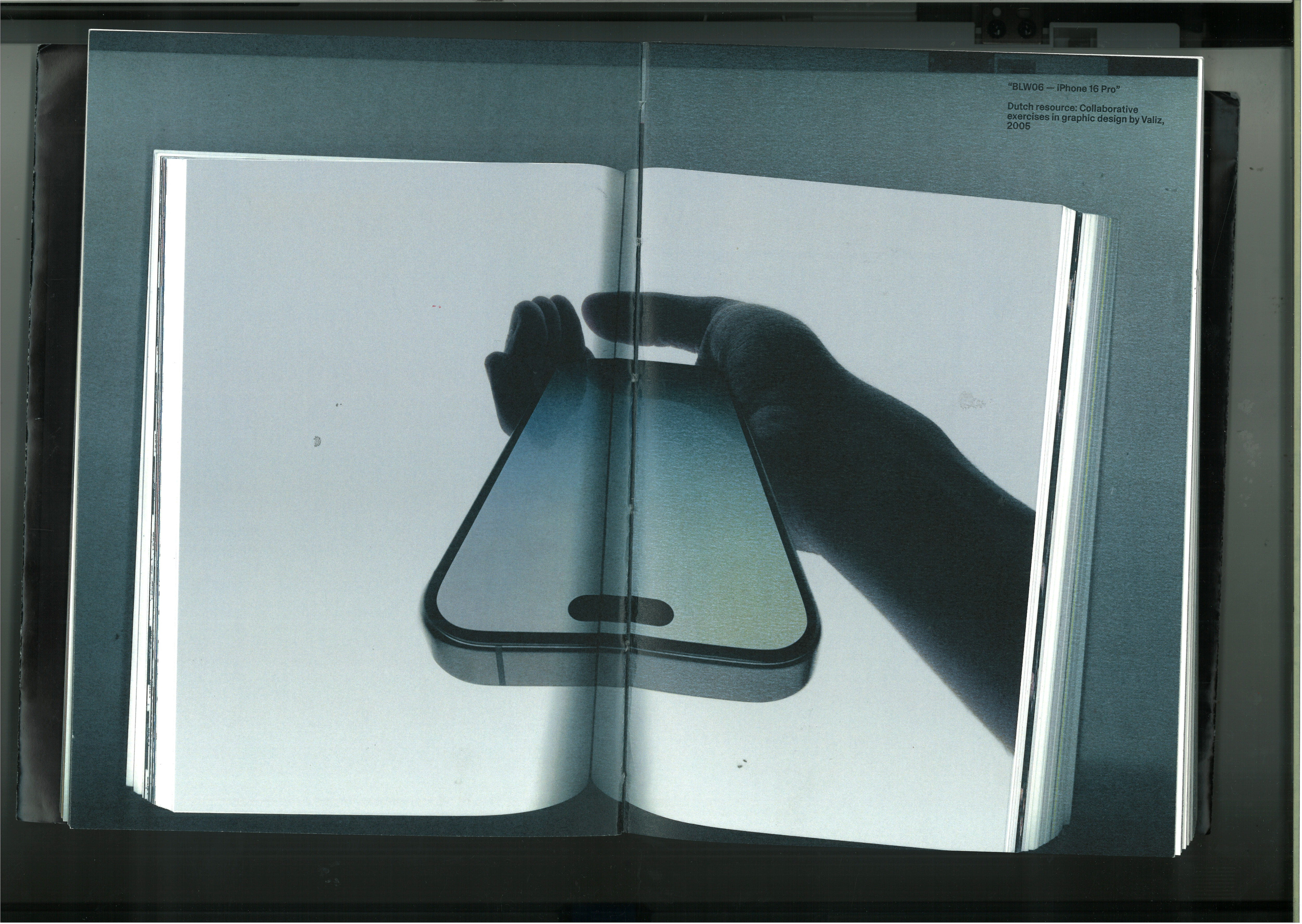In the rare case when we actually produce something physical, it will be a book (that will be binded by a local printing house worker working overnight to make all our projects happen before end terms, nothing is ever physically made by us). The bad students will later go to a photo studio and take pictures of it, with good lighting and white background. The cool students will flatbed scan it. The background would be black. Maybe a hand that’s holding the book down will show faintly. They will not edit it. They will say: “Here, this book exists. I scanned it.” By that they will mean: “This book is simply scanned, therefore it is Real. It is not a mockup.” The curious thing is that the designs of the book assignment itself are not really as different as their presentation methods are.