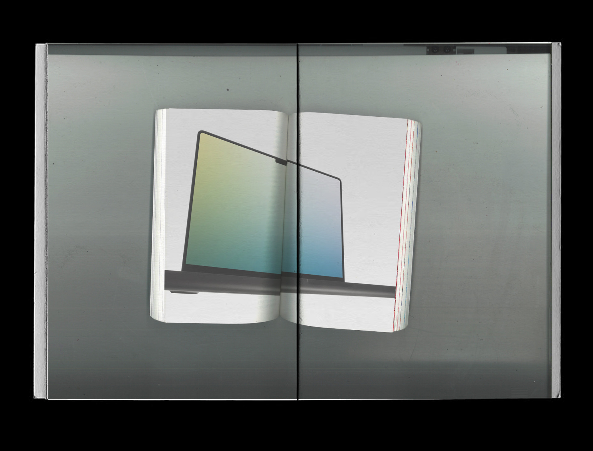 The sign marks the absence of basic reality. The image calls into question what reality is and if it even exists. Here, I put these fake realities of floating laptops into the most Real (in this case, scanned). A fake Real inside a real Real. This is a realistic printed image that was never really printed, it was never designed, and never had a purpose. It exists to prove its own existence. Just like in Jean’s theory of the Stage Three, this is an image of nostalgia for something that no longer exists. I’m documenting and presenting these fake Real artifacts, they don’t exist on their own anymore.