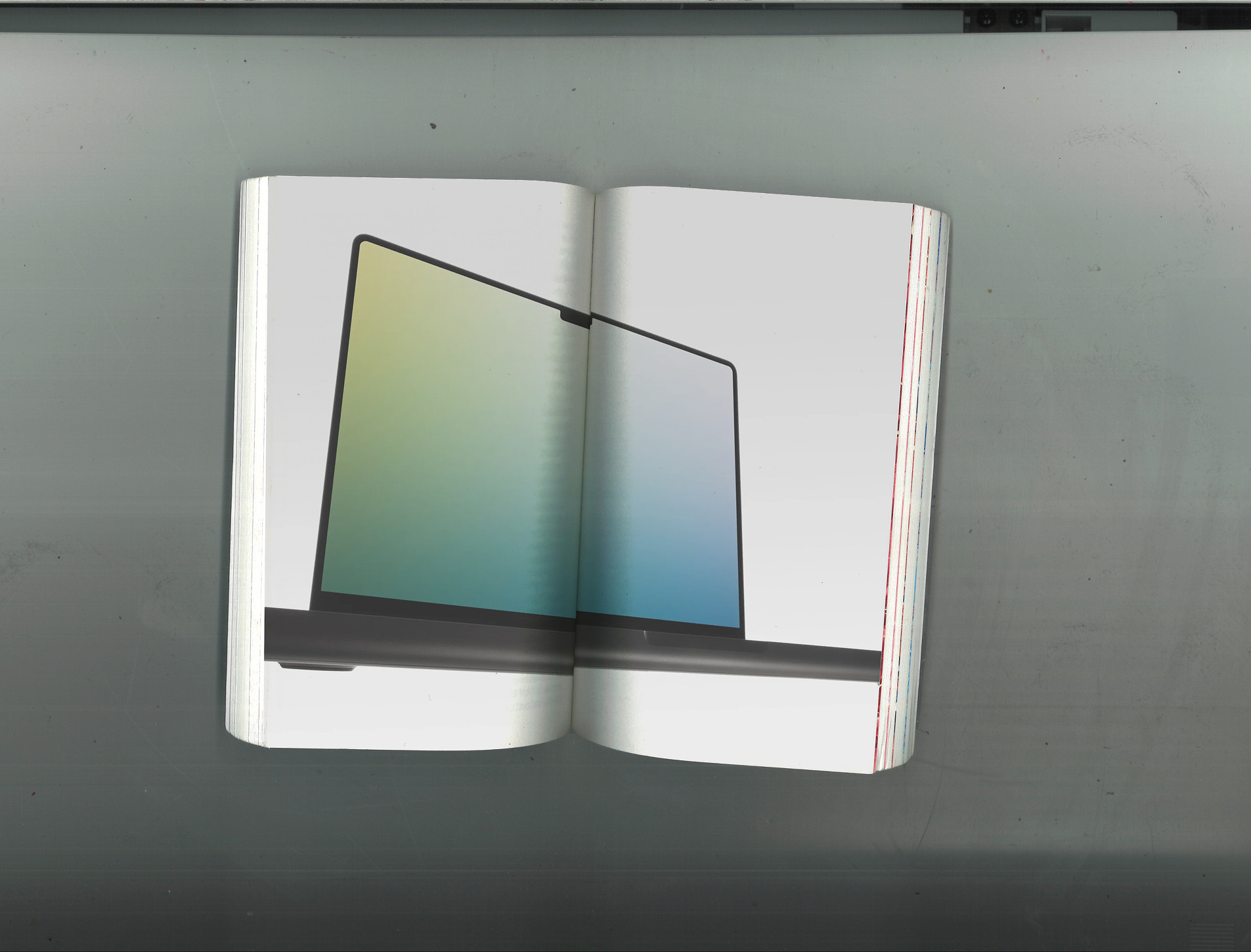 The sign makes a basic reality. The image becomes a distortion of reality. Here, someone (in this case, Directory Mockups) created a fake reality, representing something real. A universe of laptops floating in grey space, or anonymous hands holding a book, just like the ones I scanned earlier. A corporate tool that exists in a liminal space. The gradients replacing the imagined design is what I consider to be distortion here. This is still real, the majority of these images being professional photographs, or perfectly real renders.