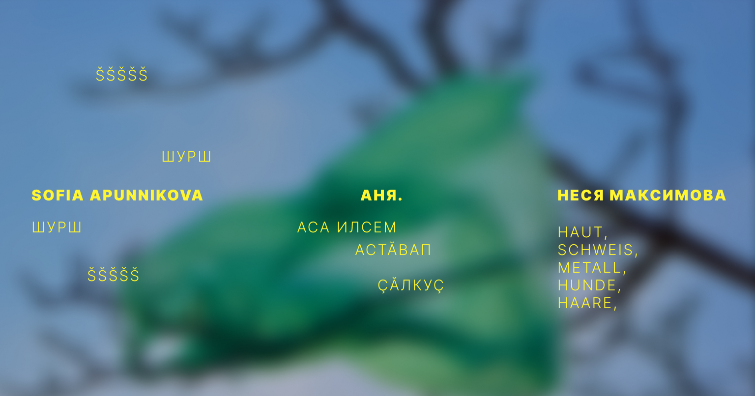 Sofia Apunnikova: Я художница, поэтесса и дизайнер из Эстонии. Сейчас живу и работаю в Берлине. В своей художественной практике я исследую темы идентичности, памяти и языка. В моей семье всегда звучали разные языки, и, кажется, именно из этого многоязычия вырос мой интерес к тому, как человек ощущает себя между культурами.