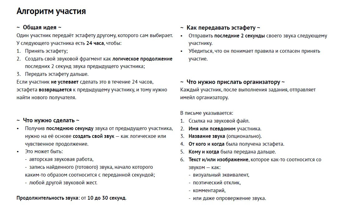 14 участников — саунд-артистов передают друг другу музыкальную эстафету, где вступлением для каждого следующего трека (иногда, правда, оставшегося за кадром) становятся последние 2 секунды трека, полученные от предыдущего участника.